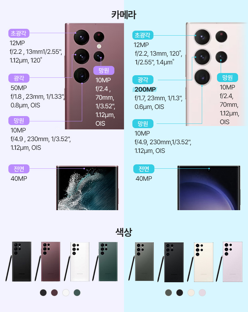 기존 S22 울트라에 비교해 약 2배가 넘는 화소수가 증가했습니다.